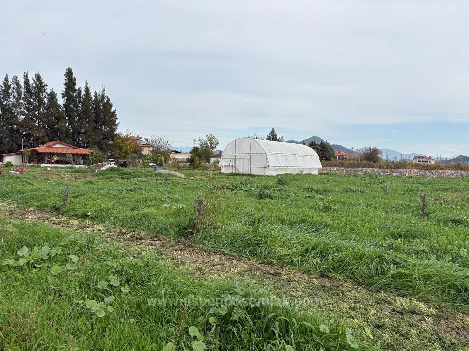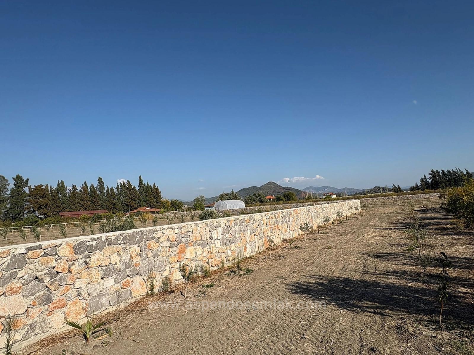 A 19,663 m2 farmland and house with vineyard/orchard land is for sale in Eskiköy. The property includes two structures. One is a house with an area of approximately 120 m2. The second structure is a covered storage area of approximately 200 m2. There are two deep well water pumps. Part of the land is olive grove and part is pomegranate orchard. It is surrounded by a stone wall. The ground has been leveled to prevent water accumulation, especially in the olive grove area, during the winter months. There are no problems with roads, water, electricity, or telephone access. The land is 5 km from Dalyan, 15 km from Iztuzu Beach, 12 km from Ortaca, and 30 km from the airport. The price is 35,000,000 TL