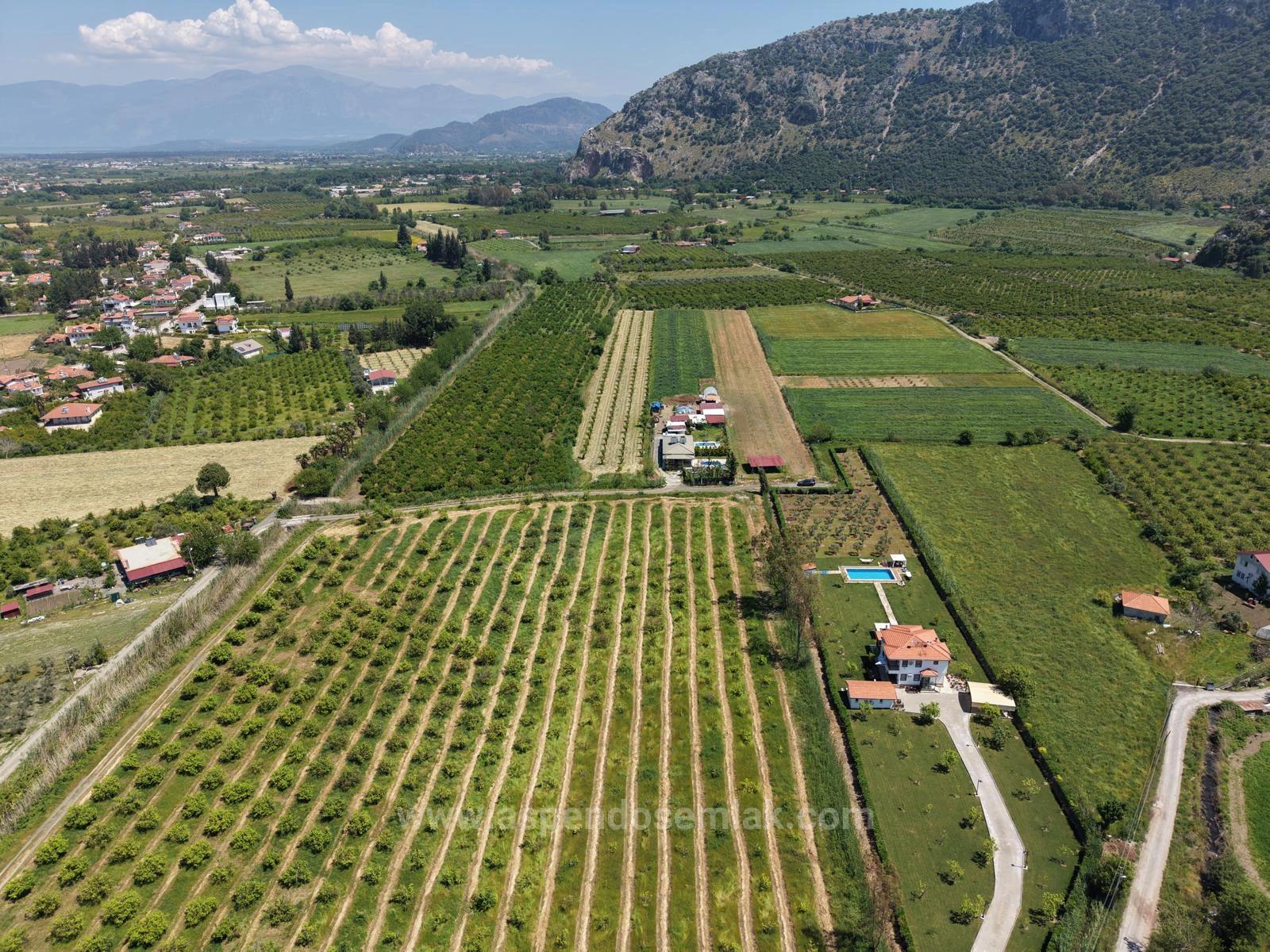 A 5100m2 plot of land, classified as agricultural land, is for sale near the center of Dalyan. It contains various fruit trees. There are no problems with road access, water, electricity, or telephone. It is close to the zoning plan boundary. There are buildings in the surrounding area. It is a suitable area for investment. It has nature and forest views. The land is 10 km from Iztuzu Beach, 1.5 km from the center, and 25 km from the airport. The price of the land is: 14,000,000 TL