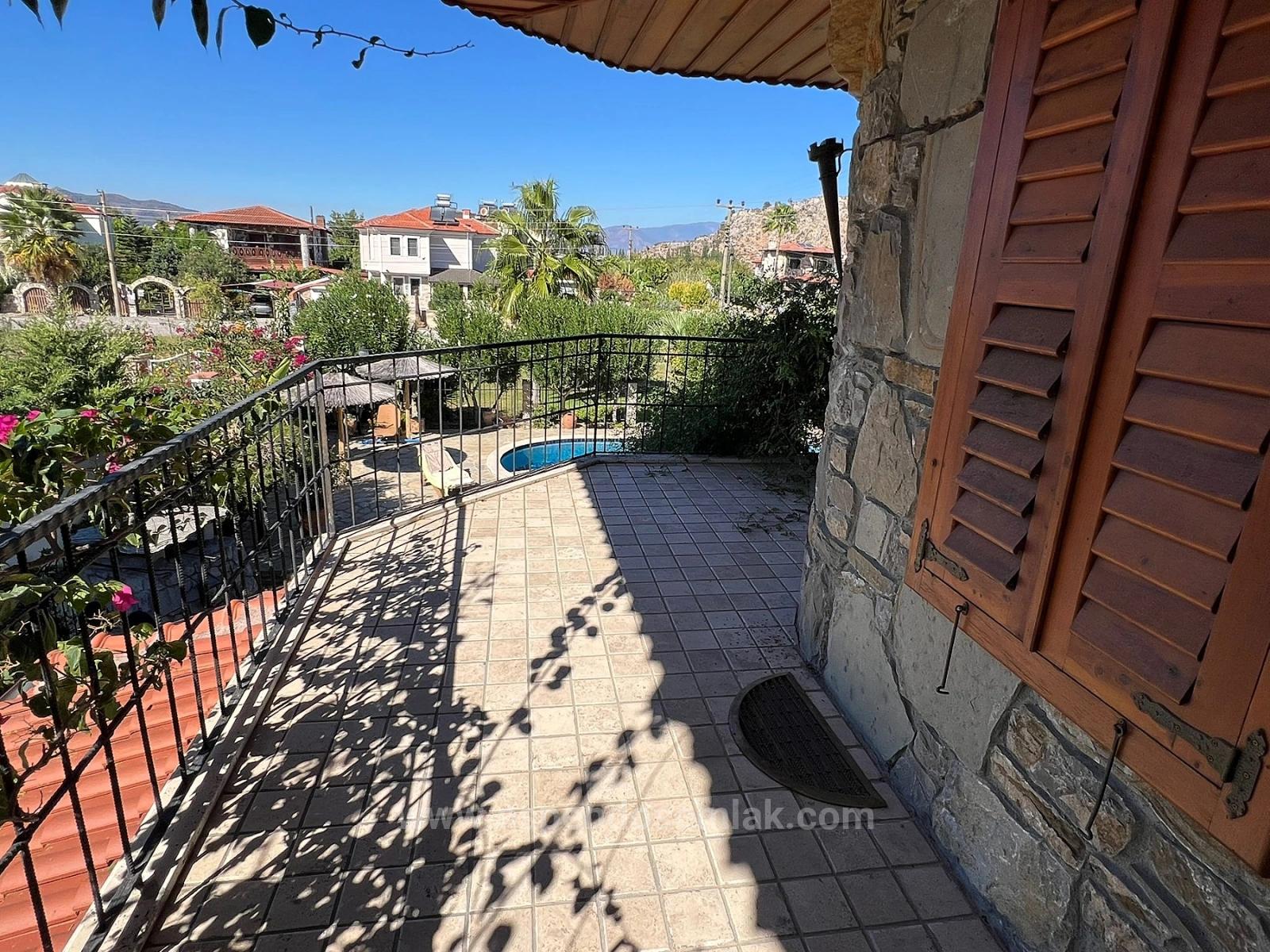 A detached stone villa is for sale on a corner plot of 580m2 in the Gülpınar area of Dalyan. It has an unobstructed view of a green area. The main building has 4 bedrooms, a large living room with an open kitchen, 3 bathrooms, 3 balconies, and a large terrace. Each room is air-conditioned. It is fully furnished. The villa is entirely constructed of natural stone with predominantly wooden workmanship. Visually, it is very stylish and in keeping with the region. It has a 45m2 outdoor swimming pool with a saltwater system. There is also a separate 1+0 bathroom and approximately 50m2 of living space. Additionally, there is a pool storage area and a storage room for materials. The villa has been recently renovated and requires no further investment. It is within walking distance of shopping markets, 10km from Iztuzu Beach, and 25km from the airport. The villa offers nature and forest views. The price is: 500,000 GBP