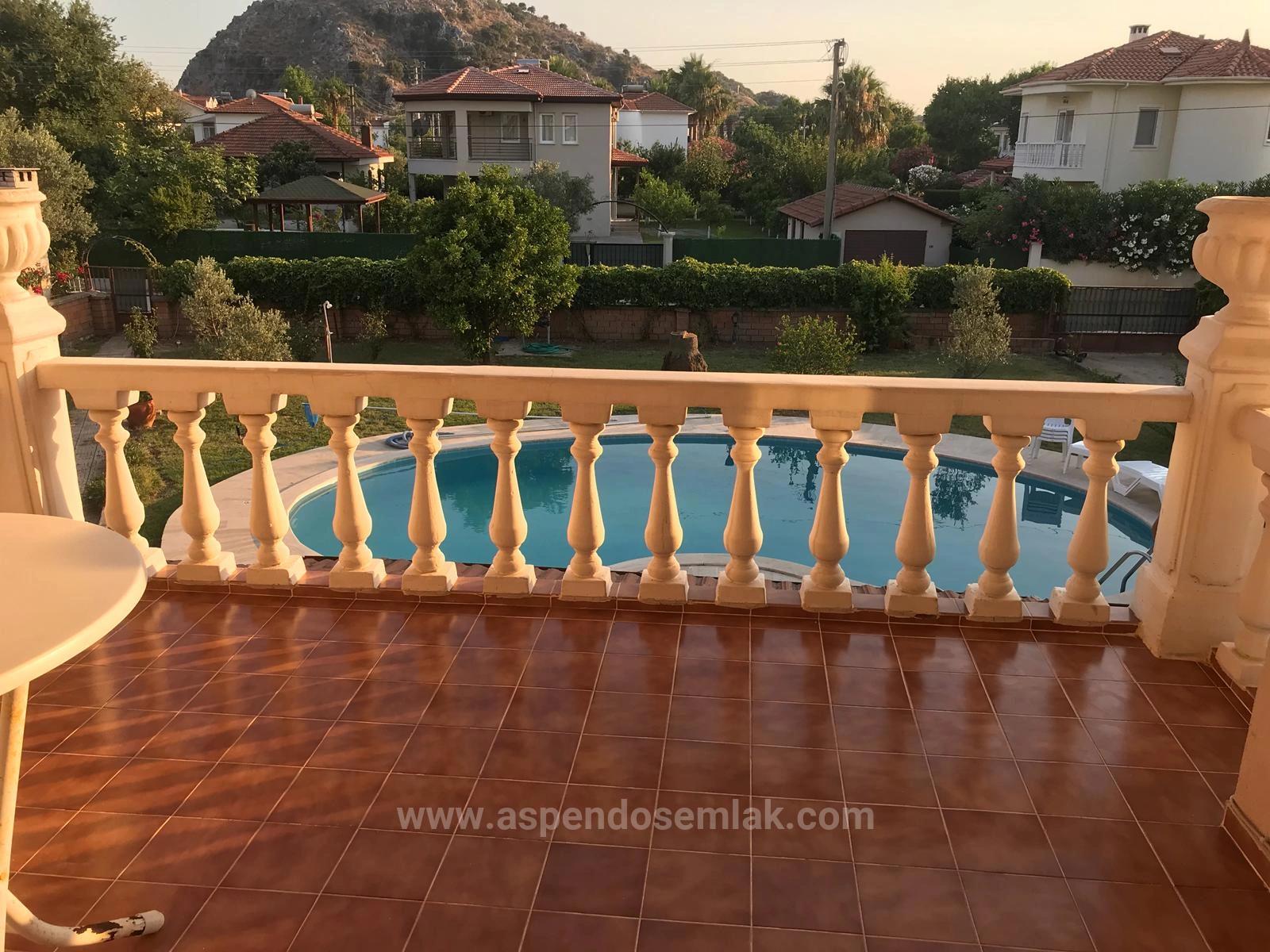 Dalyan'da 1000m2 arsa içerisinde 4 yatak odalı, 1 geniş açık salon, 1 bağımsız mutfak, 3 banyolu toplamda 250m2 kapalı kullanım alanına sahip olan villa satılıktır. Her odada klima mevcuttur. Isınma sistemi kombi kaloriferdir. Şöminesi vardır. Açık yüzme havuzludur. Geniş bahçeli olan villanın konumu alışveriş marketlerine ve semt pazarına yürüme mesafesindedir. İztuzu Plajı'na 10 km, havaalanına 25 km mesafesi vardır. Merkeze yürüme mesafesindedir. Villanın kısmen tadilat yapılması gerekmektedir. Fiyatı: 425.000 GBP